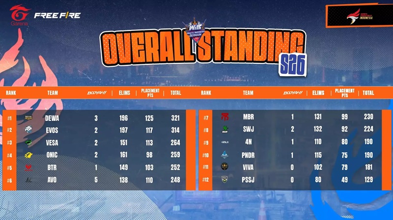 Secara keseluruhan, Anak Dewa mengoleksi 321 poin dan mencatatkan 3 kali Booyah! sepanjang grand final. Raihan tersebut membuat mereka unggul tipis atas EVOS Divine yang harus puas di posisi runner-up dengan 314 poin.